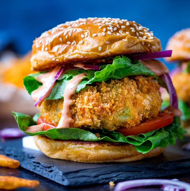 Sauce Régal, salade, tomates, oignons, cheddar, steak végétarien
